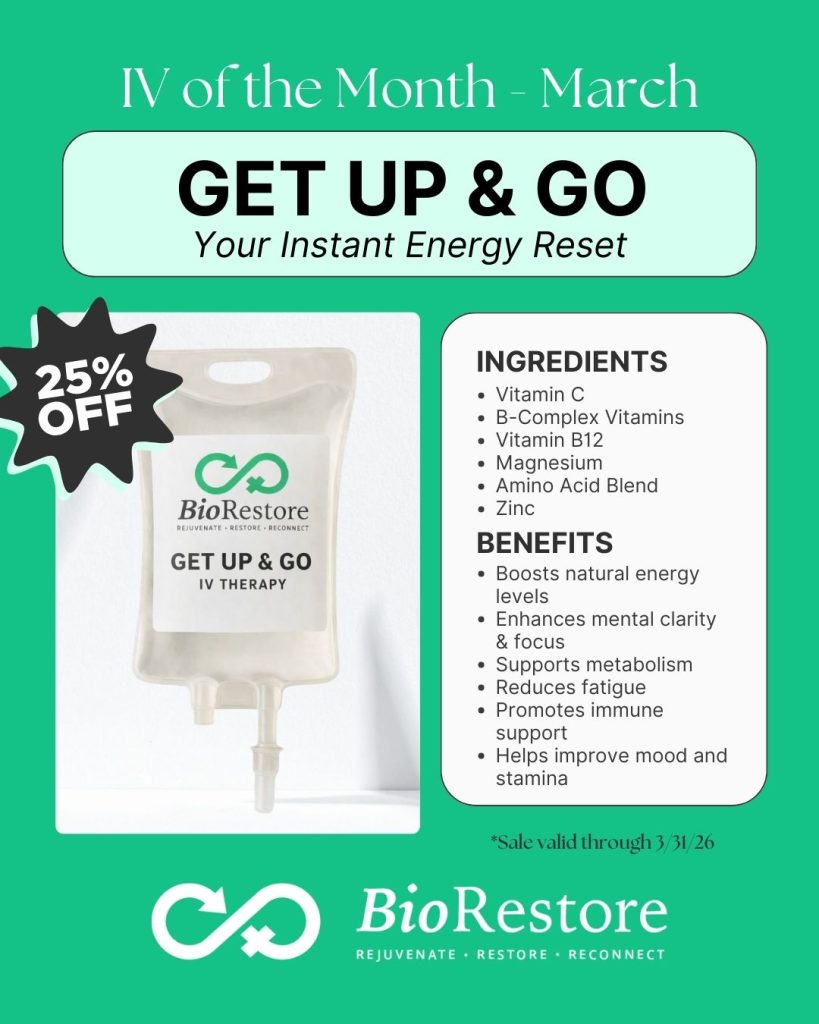 March is the perfect time for a reset. As the seasons shift and schedules fill up, energy levels can dip, focus can fade, and fatigue can creep in. That’s why our March IV Therapy of the Month is Get Up & Go – now 25% off all month long.
