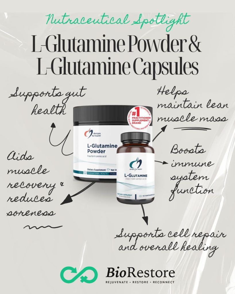 At BioRestore Health, we believe true wellness begins from within – and gut health plays a central role in how you feel every day. That’s why we’re highlighting L-Glutamine in this month’s Nutraceutical Spotlight, available in both powder and capsule form.