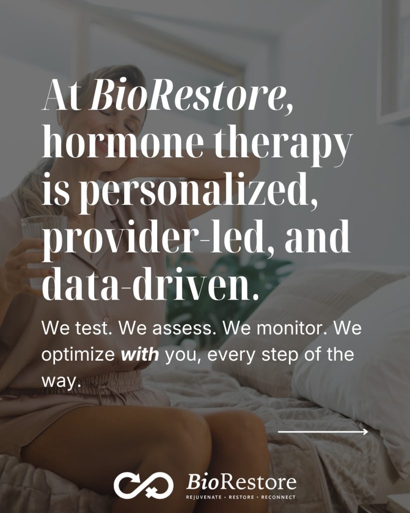 At BioRestore, hormone therapy is personalized, provider-led, and data-driven. We test. We assess. We monitor. We optimize with you, every step of the way. Our goal is to create a supportive environment where you feel informed, empowered, and confident in your care.