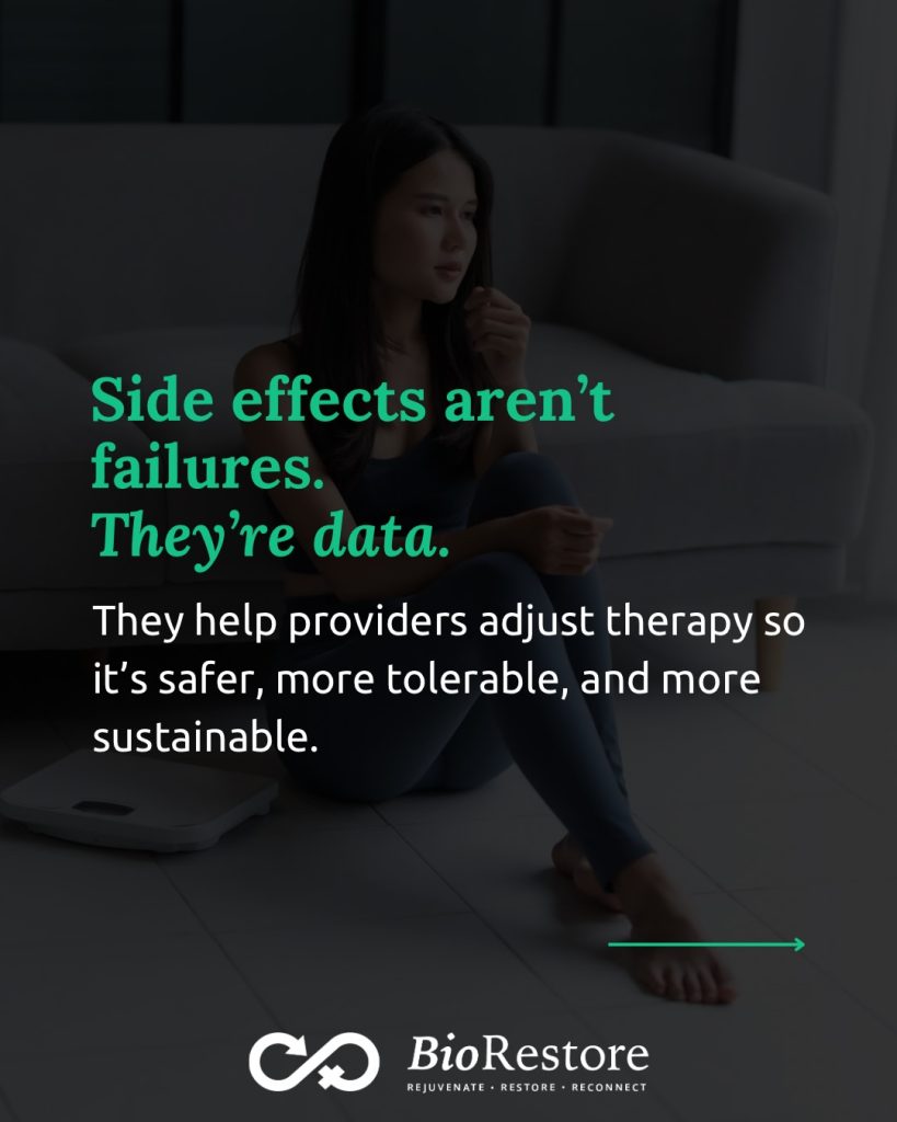At BioRestore, side effects are viewed as data — signals that help guide smarter decisions. When monitored correctly, they allow providers to adjust therapy so it becomes safer, more sustainable, and better aligned with each patient’s needs.