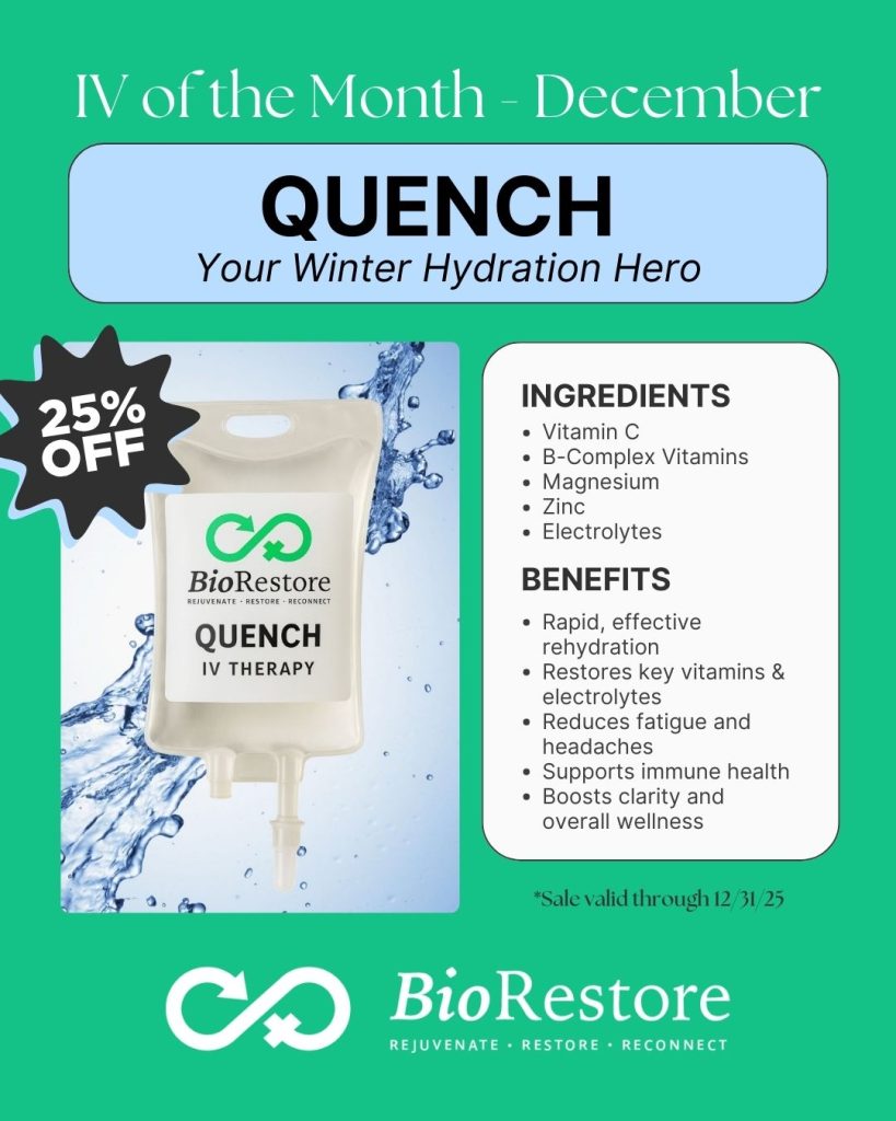 To help you stay hydrated and feeling your best, Quench IV Therapy is 25 percent off through December 31, 2025. Now is the perfect time to give your body the hydration it deserves.