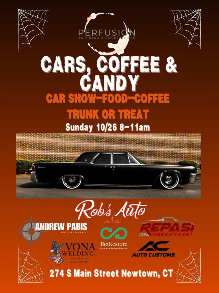 We’re excited to join Rob’s Auto for their Cars, Coffee & Candy Trunk-or-Treat at Perfusion Espresso & Cocktail Bar this Sunday, 10/26 from 8–11am at 274 S Main Street, Newtown, CT.